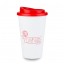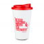 A white polypropylene double-walled insulated mug, featuring a "Pour myself a cup of ambition" design. It has a red screw lid that fixes securely to the mug to create the style of a take-out cup, but one that is dishwasher safe, microwave safe and BPA free. It is 155mm tall and 95mm wide and hold approximately 35cl.