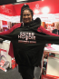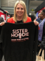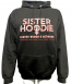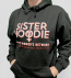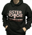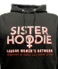 A black hoodie featuring a "Sisterhoodie" design, it's made from soft cotton and has twin needle stitching detailing, a double fabric hood with self coloured cords and a kangaroo pouch pocket with small hidden opening for earphone cord feed. Ribbed cuffs and hem complete the garment which is a Worldwide Responsible Accredited Production (WRAP) certified production.